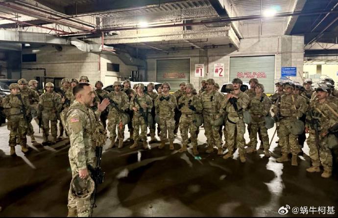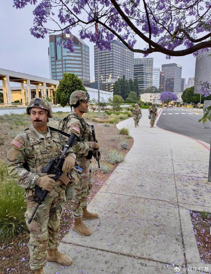 來自加州國民警衞隊的第79步兵旅已被部署到洛杉磯市中心的聯邦拘留所外,他們配備了防暴裝備和裝有子彈的M4步槍。