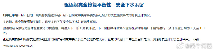 朝鮮方面預計6月下旬之前完全修復該艦。