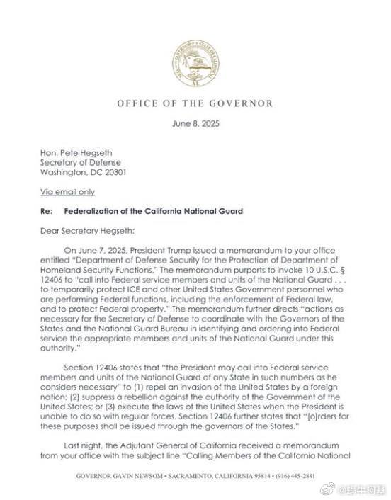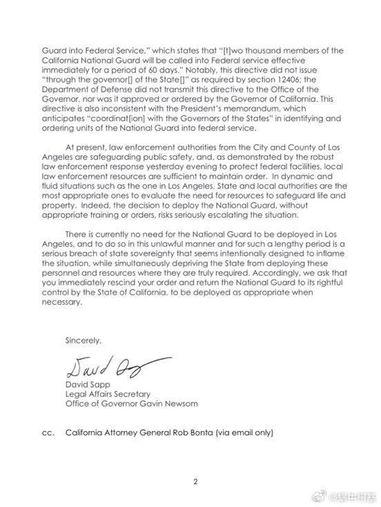 加州政府要求美國聯邦政府撤銷對國民警衞隊的部署,要求國防部長將加州國民警衞隊的控制權交還到州里,並稱此舉是對加州主權的嚴重侵犯。