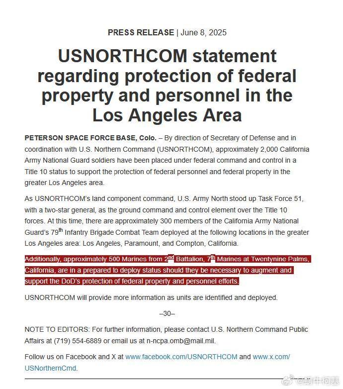 美國北方司令部稱除了已經部署的300名國民警衞隊,另有500名馬潤準備部署到洛杉磯