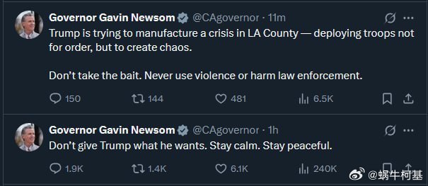 太能演了,加州州長一邊懇請自己的子民不要鬧事,不要衝擊警察,一邊指責特朗普使局勢升級