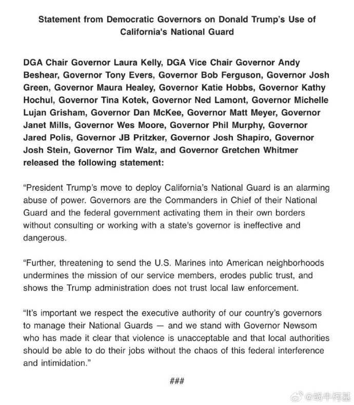 所有現任民主黨州長都簽署了一份聲明,譴責特朗普使用國民警衞隊平息抗議活動。