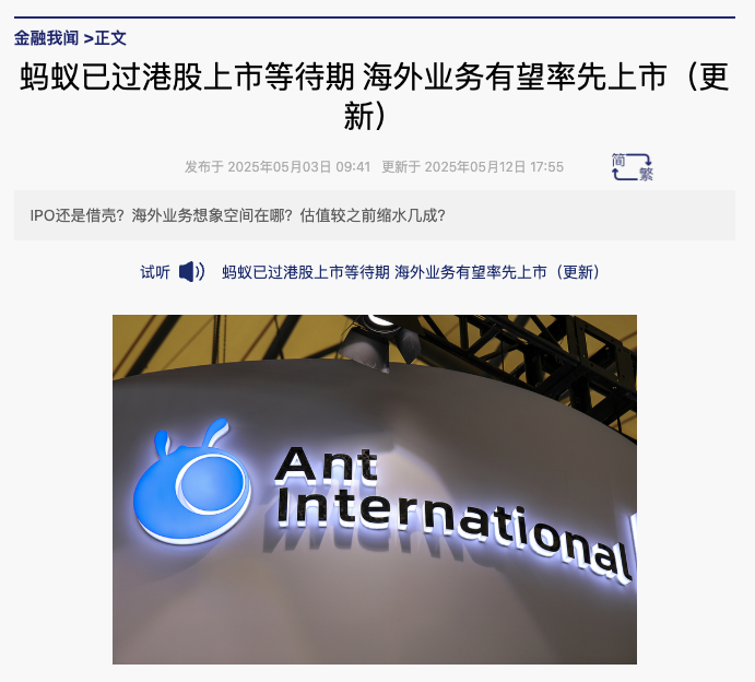 2025年5月初,財新引述消息人士稱,螞蟻集團擬分拆海外板塊“螞蟻國際”單獨在中國香港上市,目前正在和監管部門溝通可能性。