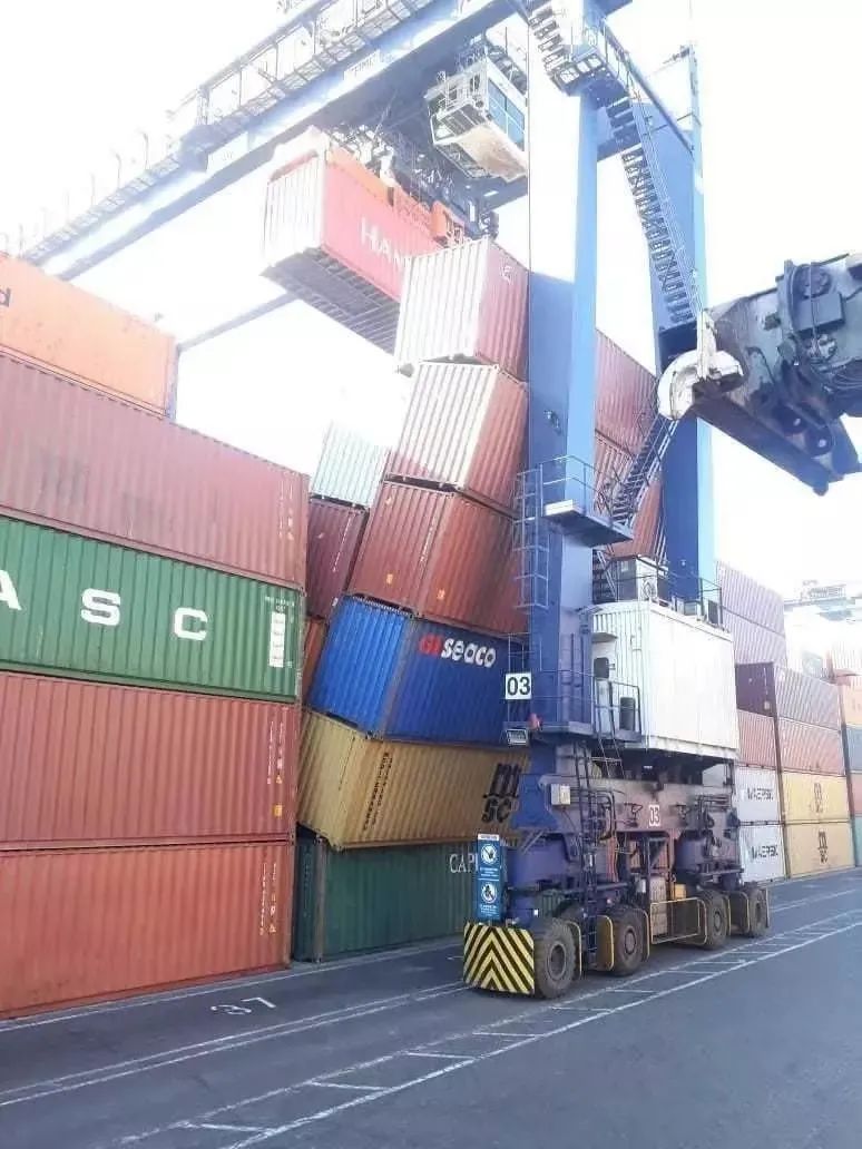 李華是一名場橋司機,正在進行集裝箱裝卸作業,卻發生了“打保齡”事故,假設每個集裝箱質量為m,正在作業的集裝箱(編號1)以加速度 a勻減速向右運動,後方集裝箱間距極小,依次傾倒,已知集裝箱間動摩擦因數 μ,請回答圖中是哪個碼頭。