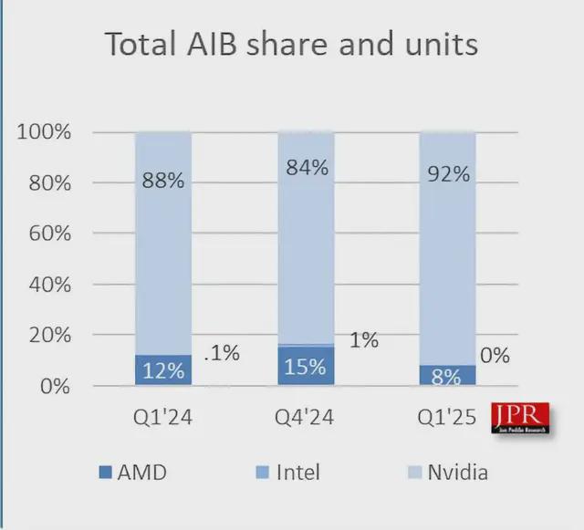 英偉達在1月至3月期間售出了數百萬台RTX 50系列GPU,而AMD的Radeon 9000系列出貨量不足75萬台。英偉達的市場份額飆升至歷史性的92%,將AMD擠壓至8%的歷史低點,英特爾幾乎寸步難行。喬恩·佩迪表示,AMD的產量不足是造成這一巨大差距的主要原因。