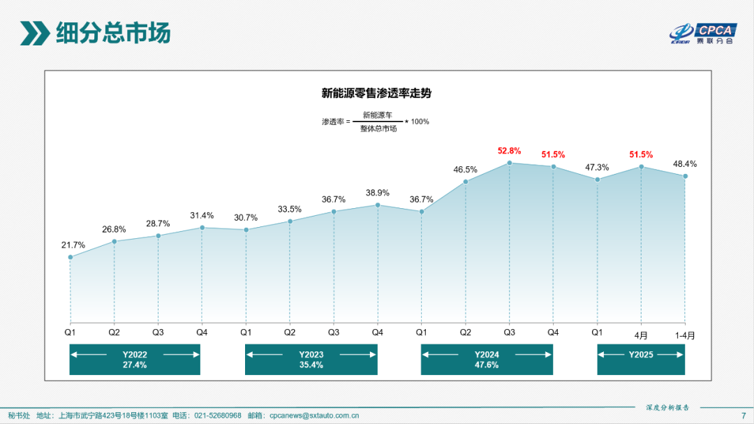 乘聯分會最新數據顯示,4月,我國新能源汽車的零售滲透率為51.5%。