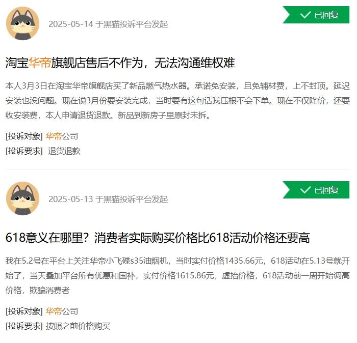 在“黑貓投訴”平台上,有近2800條投訴包含搜索詞華帝;其中有不少消費者投訴華帝的價格差問題以及產品質量、售後服務等問題。