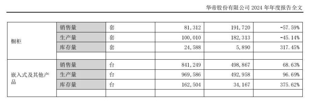 年報數據顯示,2024年,華帝的吸油煙機銷售量253.7萬台,同比增長7.22%,雖增長但未能跑贏行業;而灶具、消毒櫃、櫥櫃三大業務更是全面下滑,其中消毒櫃銷量同比暴跌18.96%,下滑最明顯的櫥櫃產品更是出現57.59%的銷量暴跌。