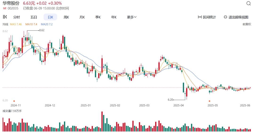 業績增速放緩,也傳導到華帝股份的股價表現上。2024年底,華帝股份的股價曾衝高至8.78元/股;截至6月9日收盤,華帝股份報收6.63元/股,股價相比去年底高點下滑超24%,總市值不足56億元,蒸發超18億元。