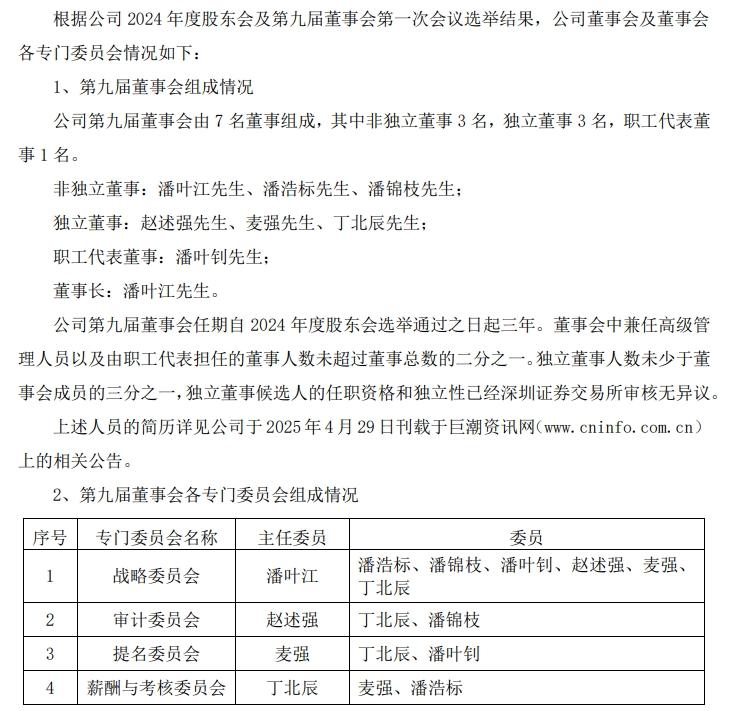 根據華帝股份最新的董事會換屆選舉公告,當前華帝董事會共有7位董事,其中非獨立董事3名均是潘姓,包括潘葉江、潘浩標、潘錦枝;此外,職工代表董事是董事長潘葉江的兄弟潘葉釗,潘浩標之女潘楚欣是華帝股份董事會秘書。