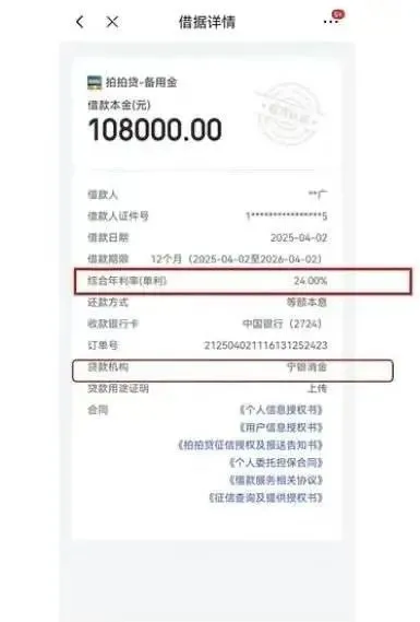 此次借款的資金方是浙江寧銀消費金融股份有限公司,服務環節由拍拍貸的關聯企業——上海耳序信息技術有限公司負責,京東則承擔了導流角色。雖然這位老師與資金方“默認”簽訂的借款協議中,年利率僅為3.7%,但經過京東的撮合、拍拍貸的擔保,以及各類服務費、管理費等多重環節,最終他實際承擔的綜合年化成本卻高達24%。