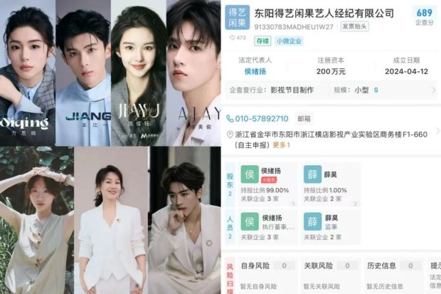 但時移世易,**流量時代退了一步的正午,如今卻在影視寒冬裏悄然搶灘經紀業務。**正午近期官宣大戲《諜報上不封頂》《櫻桃琥珀》裏飾演女二的“00花”沈佳鈺,來自一家名叫得藝的經紀公司,而得藝的大股東正是正午董事長侯鴻亮之子侯緒揚。得藝除了廣籤小花、小生,還簽下了像閆妮這樣的老戲骨。