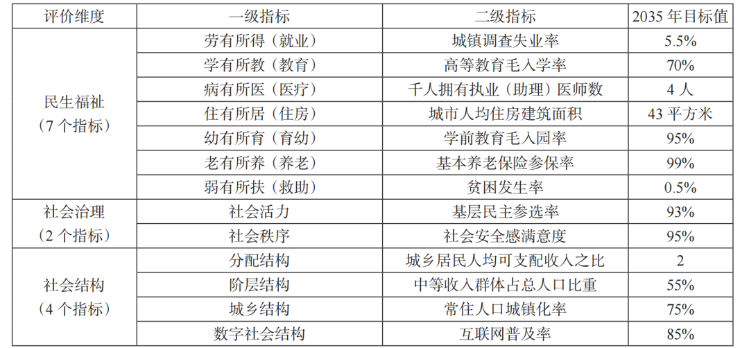 社會建設的民生福祉指標需衡量現代化的社會富足水平,滿足人民的公共服務需求,主要包含就業、教育、醫療、住房、育幼、養老、社會救助等方面的內容,需立足經濟發展水平不斷提升人民生活品質,到2035年爭取實現民生“七有”到“七優”的發展。該維度的目標值既體現現代化進程中人民生活更加幸福美好的過程,也反映民生類指標的結構特徵。