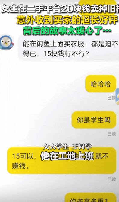 有女孩在互聯網上分享自己賣舊衣服的故事,她知道買家是工地工人後,兩件冬裝就賣了20塊錢。後來她收到了買家一段長長的好評,字裏行間都是樸實的感謝。