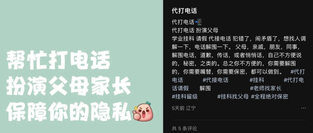 掛科的大學生可以找到"專業父母"幫忙應付學校電話;社交恐懼者可以購買代打電話服務;起牀困難户可以定製專屬叫醒服務……