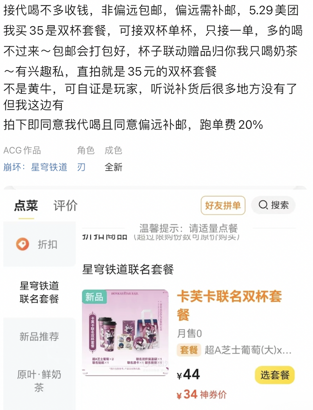 最特別的一種是”代喝“服務。許多奶茶和知名IP出聯名款,雖然單價不貴但參與人數眾多。這個時候,如果有人想要聯名款相關的贈品,但並不想喝奶茶,就可以拍下”代喝“服務,奶茶有人幫你代喝,聯名款贈品再郵寄給你。