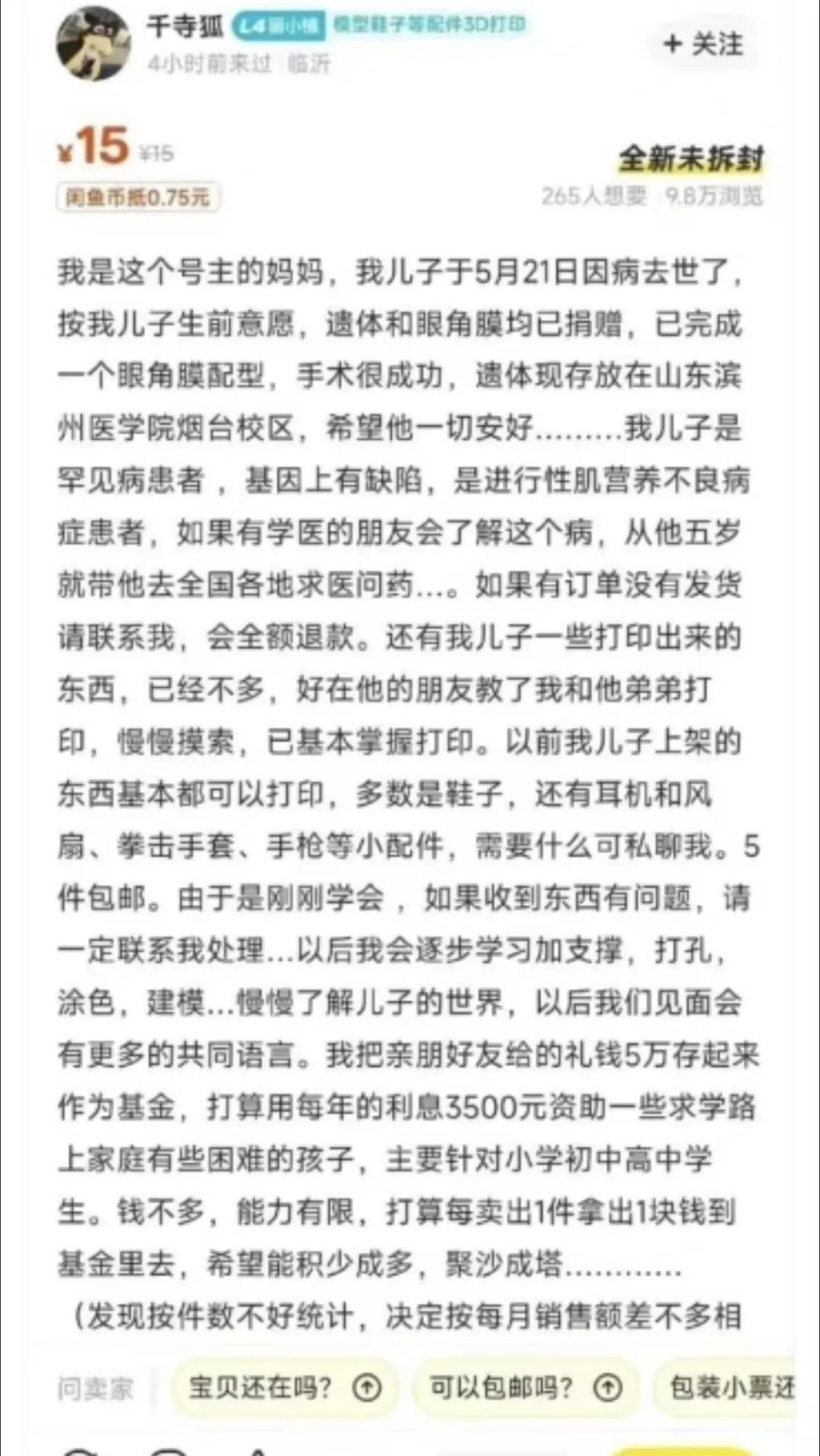 這又讓人想起另一個發生在二手平台上的“小事”。有一位25歲的3D建模賣家,5歲時就被確診患上了一種罕見的基因缺陷性疾病,他沒法和普通人一樣在户外盡情玩耍,但他愛上了建模,就在二手平台上開了個小店,因為他的3D打印物美價廉,所以有不少學生黨光顧。