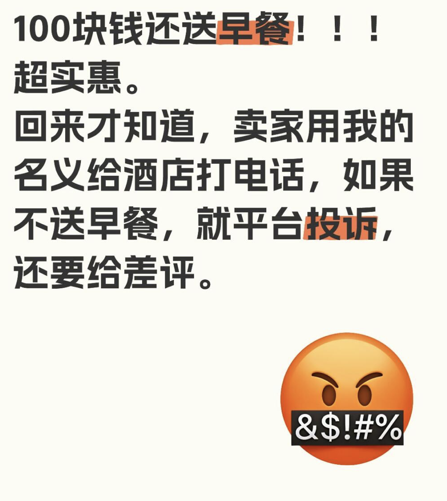 免費的酒店早餐,其實是賣家用買家的身份瘋狂投訴並威脅差評後換來的結果。