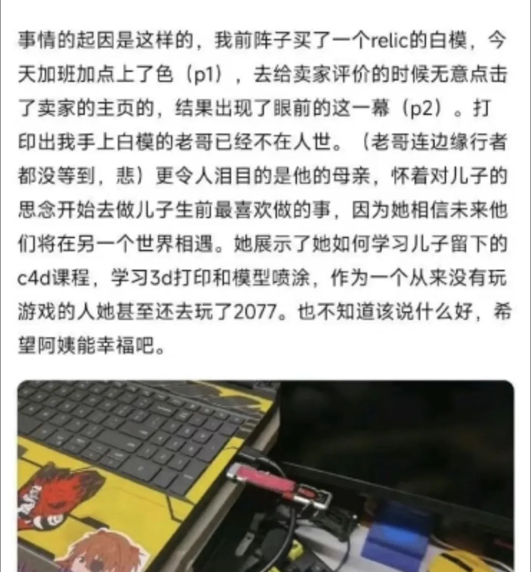 但突然有一天這家店鋪的運營中斷了,客人發的消息也沒人回覆,後來店鋪雖然重新開張了,但產品的質量大不如前,有的買家還收到了錯誤的模型型號。後來一些買家得知,原來之前的店主已經去世了,是店主的媽媽發現兒子在開店,就決定學習3D打印和建模,並繼續為老客户們製作模型。