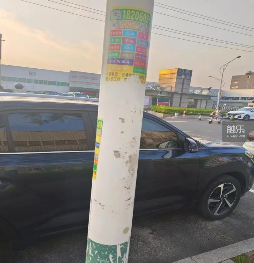 公司外大馬路兩邊停滿了車,隨處可見類似的小廣告,其中借貸、婦科內容佔據大半