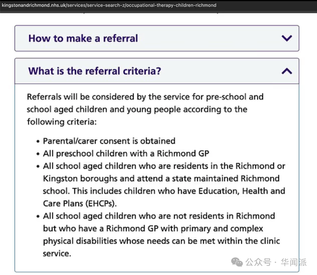 在金斯頓和里士滿國民保健服務基金會信託網站上,這樣寫道:“如果就讀於里士滿公立學校且住址在里士滿或金斯頓,學齡兒童和青少年可通過學校特殊教育協調員轉介進行評估。”