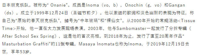 這支樂隊的貝斯手兼主唱,名叫Inoma,於19年患口腔癌症去世,享年53歲。他有一個稱呼:“日本朋克的活化石”。