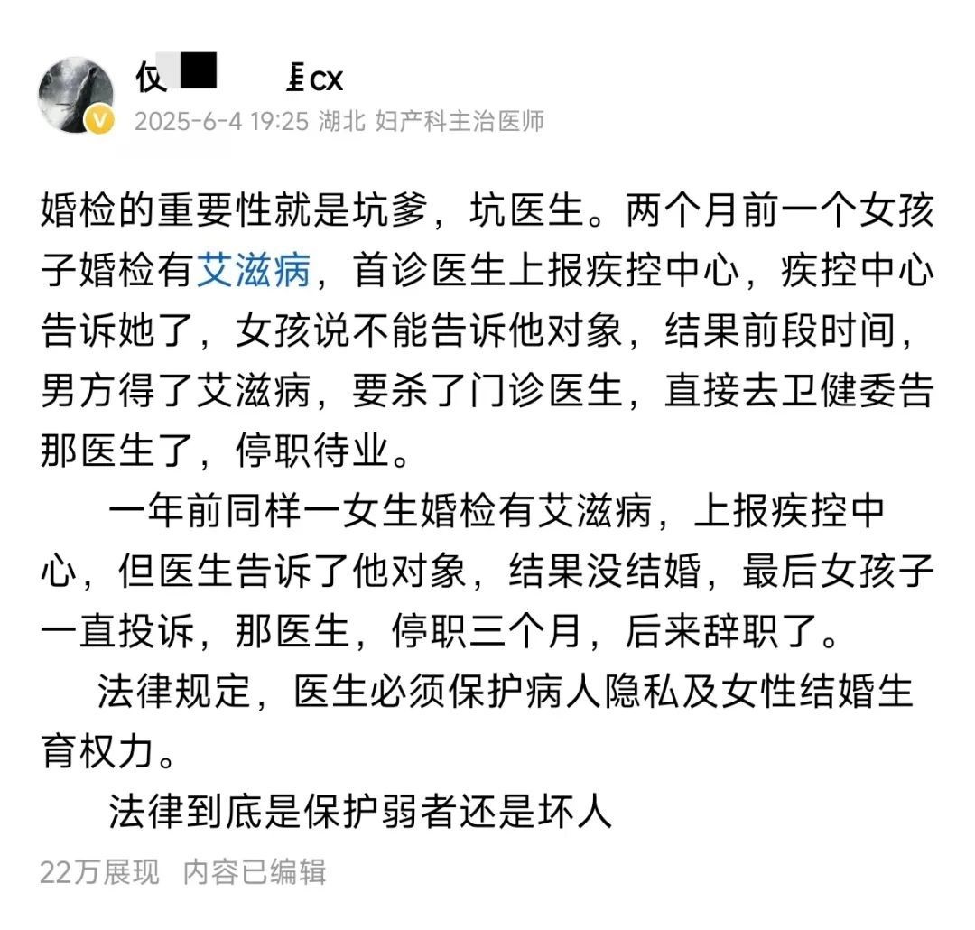 近日,湖北某醫院一名婦產科主治醫生在社交平台發文表示,由於婚檢結果涉及患者隱私,無論是否告知患者的另一半,醫生都被坑慘了,可如何是好。