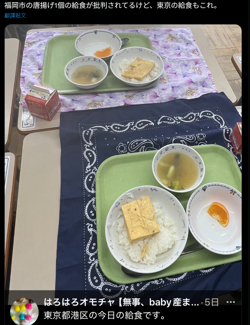 這並不是個例。除去福岡以外,東京港區的家長也曬出了孩子的午餐。一個雞蛋塊配飯,一碗味增湯,一塊八分之一的橙子,看起來似乎比福岡的小學生午餐更寒酸。福岡好歹還有點肉食…