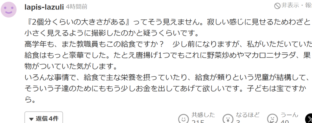 “(福岡市)説是有兩個雞塊那麼大的大小,但怎麼看都不像。我甚至懷疑是不是故意拍得那麼小,是為了讓畫面看起來更寒酸。高年級的孩子也是這份午餐嗎?老師們也是吃這個嗎?雖然已經是好幾年前的事了,但我吃的學校午餐比這要豐富得多。就算只有一塊炸雞,也會配上炒蔬菜、通心粉沙拉、水果之類的。