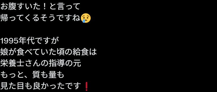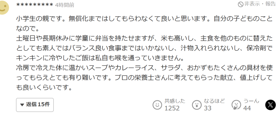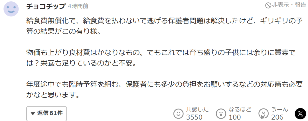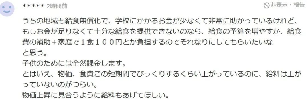 “我們這邊地區也實行了學校午餐免費化,減少了家長負擔,真的幫了大忙。但是如果因為經費不足,無法提供足夠的午餐的話,我覺得還是應該增加給餐預算,或者採取補助加家庭自付的方式,比如每餐自付100日元左右,保證午餐質量。