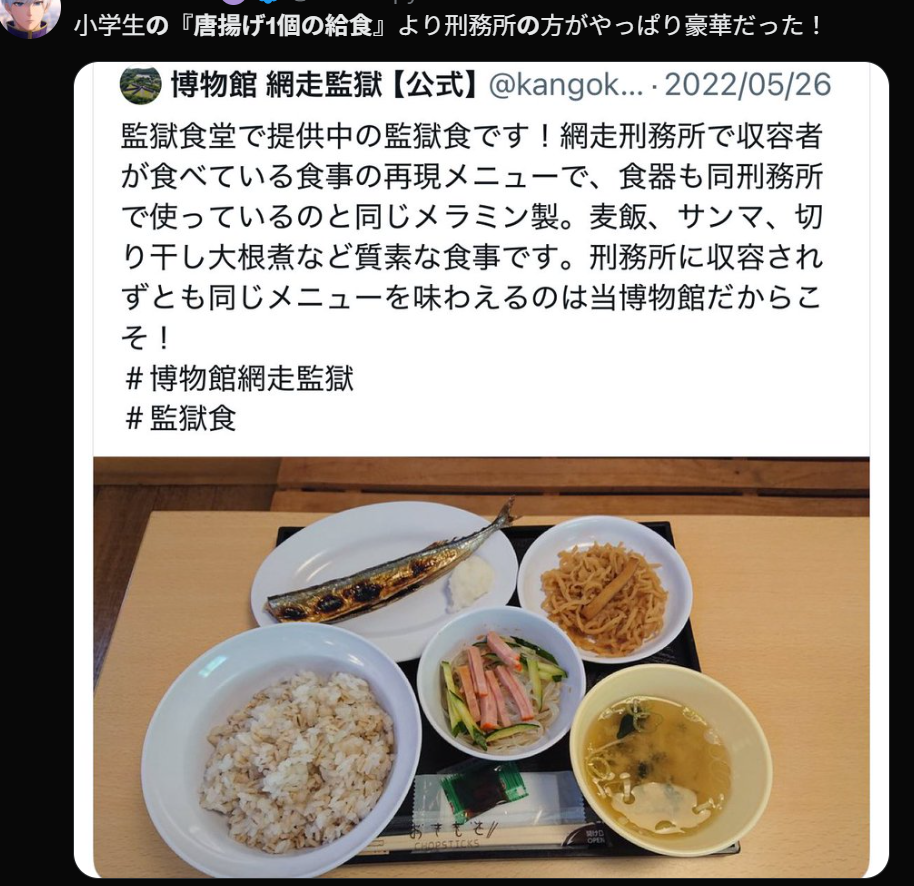 網友表示,看了日本這些小學的午餐,以為是醫院的午餐。還有更嘴毒的日本網友説,以為是監獄的午餐,結果查了一下日本監獄吃什麼,竟然比學校午餐還豐盛😅