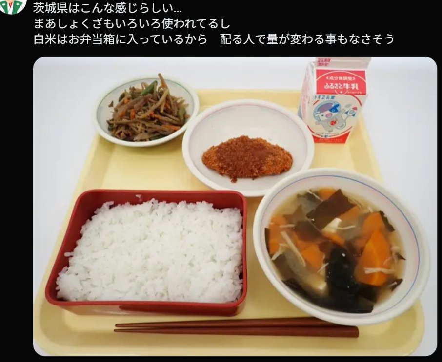 茨城縣的家長也曬出了孩子的午餐。比起上面兩位,確實好了一點,但也不能説有多豐盛。