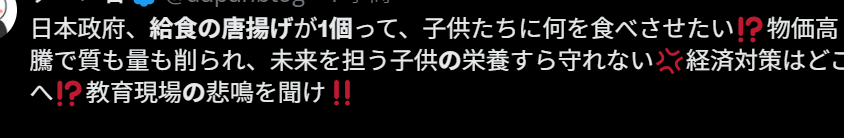“日本政府,學校午餐的炸雞隻有一塊,是想讓孩子們吃什麼!?因為物價飛漲,連食物的質量和分量都被削減,連承擔未來的孩子們的營養都無法保障嗎?所謂的經濟對策都去哪了!?請傾聽教育現場的呼聲!!”