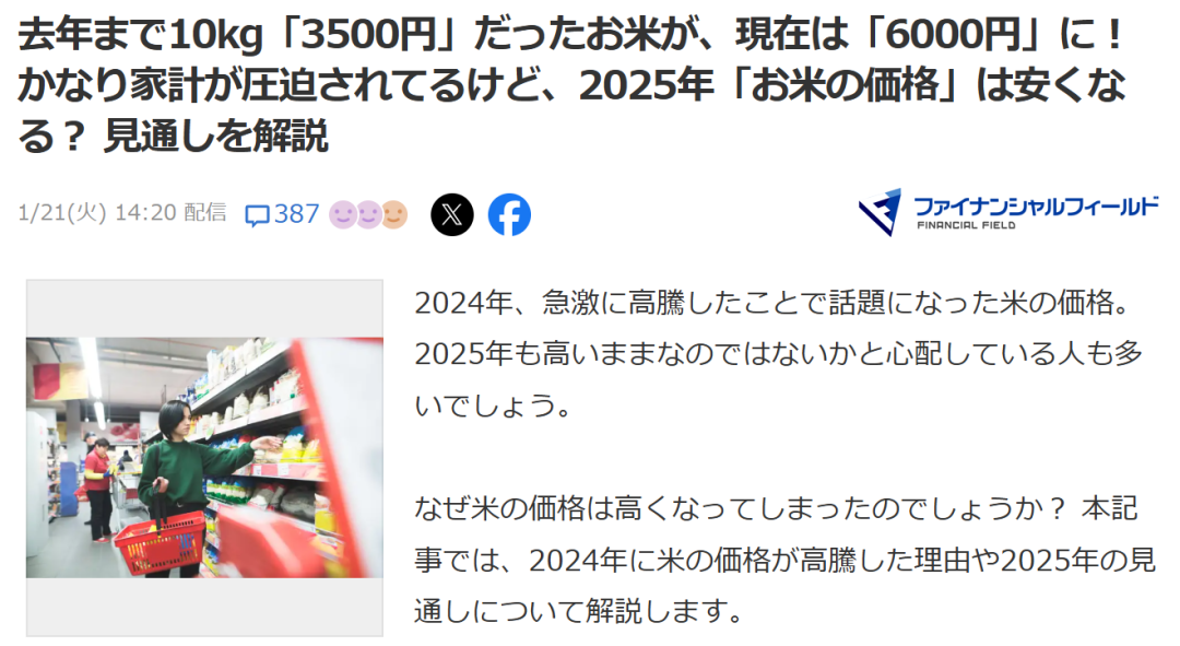 今年一月,日本新聞媒體報道,往年10kg3500日元的大米,已經漲到6000日元。