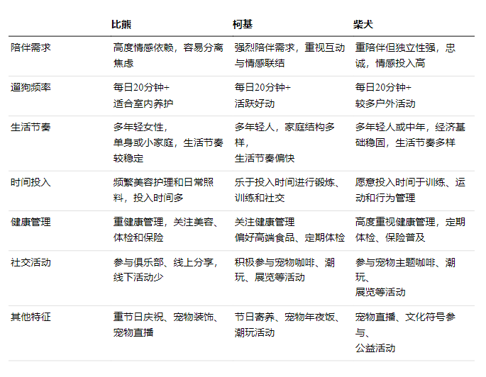 比熊、柯基和柴犬是最受中國寵物主歡迎的前三大品種,這三類犬主人的典型特徵與社羣消費趨勢呈現出鮮明差異,這些差異也推動了寵物經濟的多元細分與持續創新。