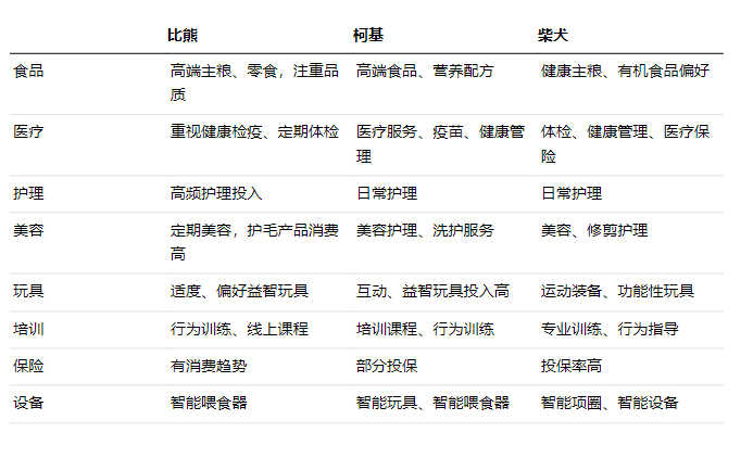 比熊、柯基、柴犬三類犬主均高度重視食品、醫療和基礎護理等剛需消費,但在消費行為類別上也展現出顯著差異。