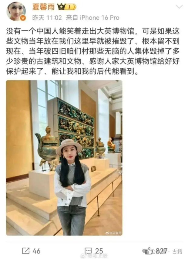 近日,女演員夏馨雨在大英博物館中國文物前的爭議微博,在網上引發了巨大的爭議。她“感謝大英博物館好好保護中國文物”的論調,以及對中華民族的隱晦貶低,更將文物保護、民族認同與公眾人物責任等議題推到了公眾面前。