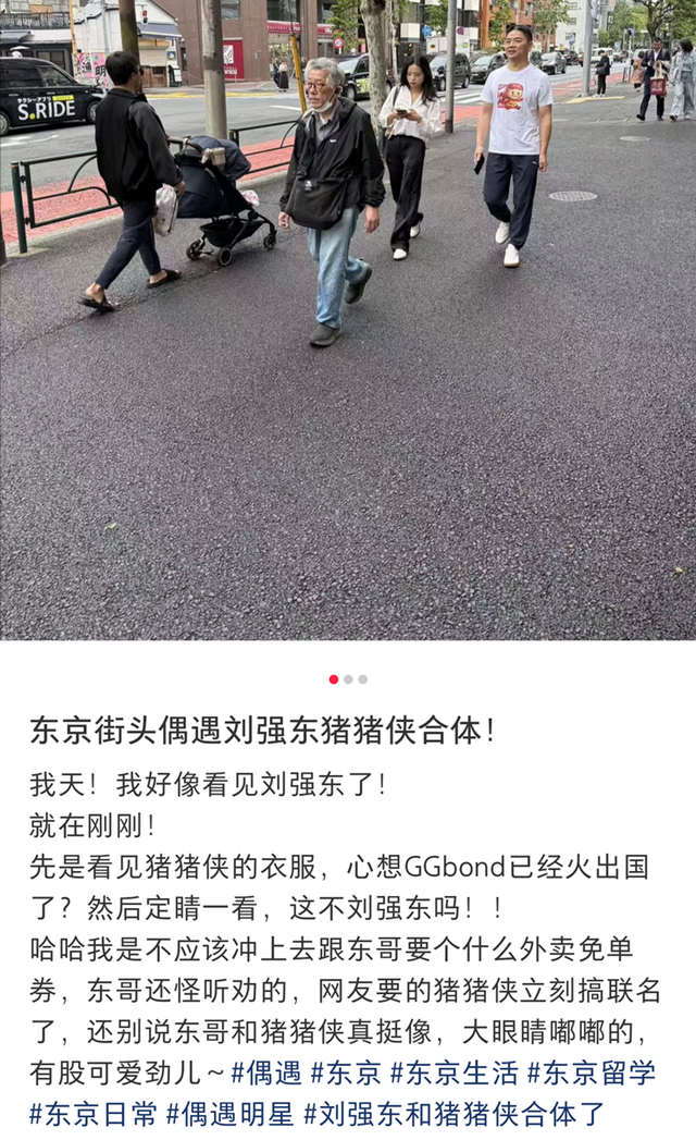 之後,劉強東甚至還跑到日本給京東外賣拉客。有網友在東京街頭偶遇劉強東,看見他穿着一件豬豬俠T恤在街上走着,T恤背面印着京東外賣的二維碼,十分吸引人眼球。