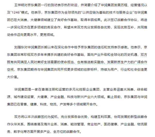 但如今這一戰略簽約的不同之處在於,這是京東與華潤首次在集團層面達成全面戰略合作,意味着兩大巨頭之間的合作邁向了更高水平、更寬領域。