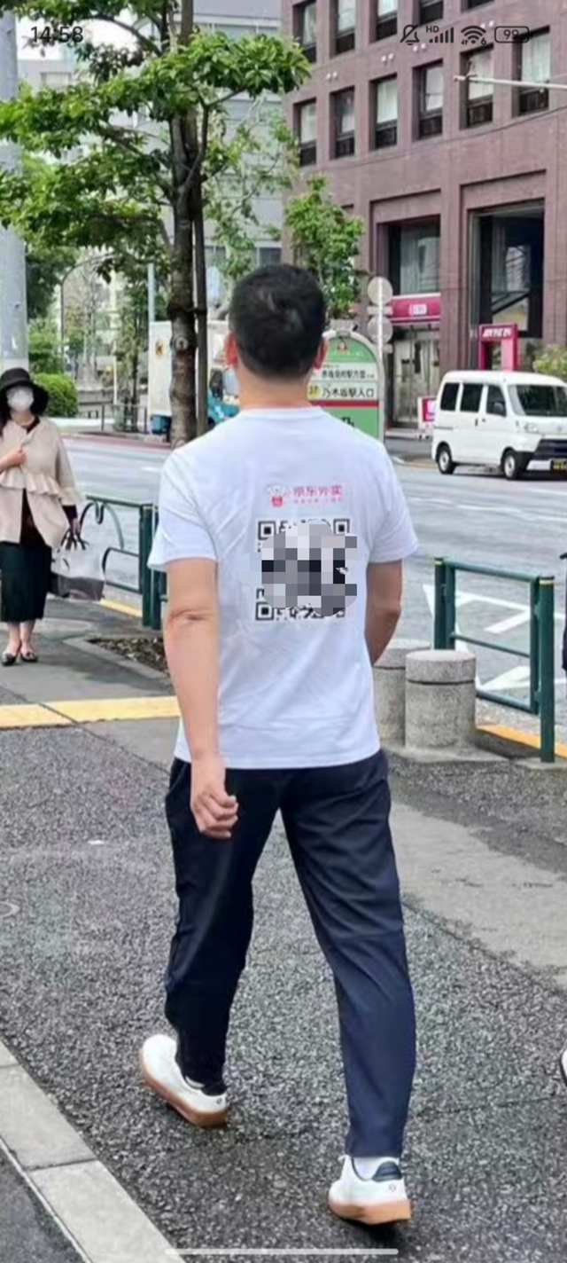 之後,劉強東甚至還跑到日本給京東外賣拉客。有網友在東京街頭偶遇劉強東,看見他穿着一件豬豬俠T恤在街上走着,T恤背面印着京東外賣的二維碼,十分吸引人眼球。