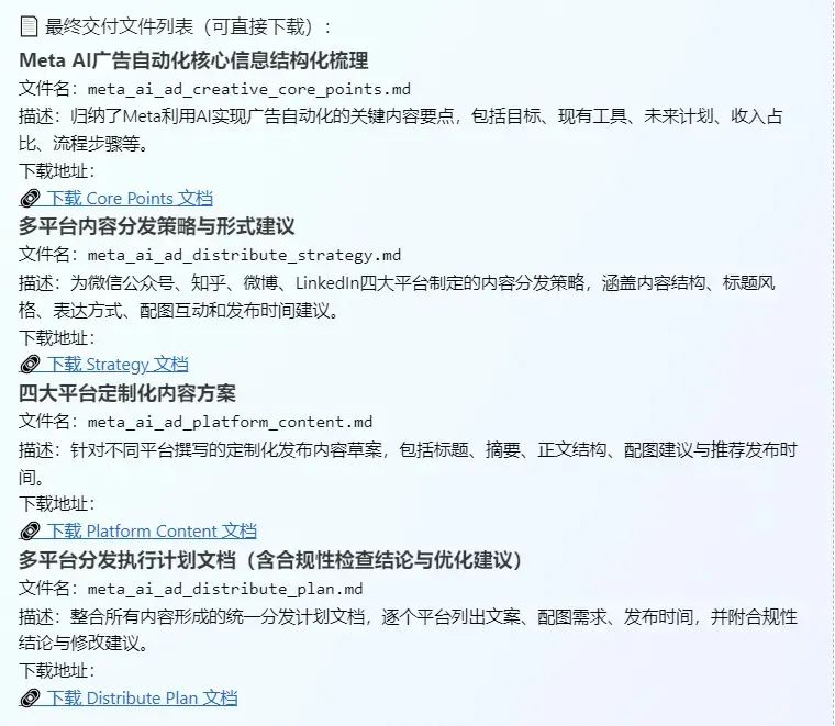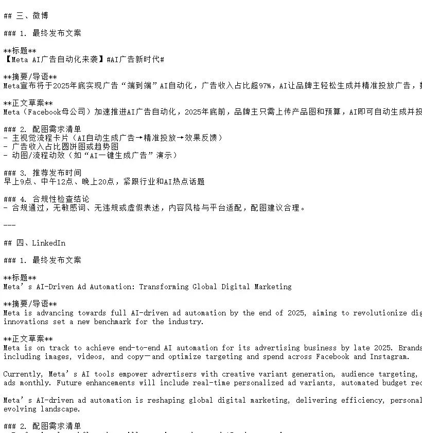 從結果來看,CoCo完成度非常高,我們用“ Meta計劃利用AI全面自動化廣告創意 ”這一新聞通過調用工作流直接生成了可以在微信公眾號、微博、知乎、以及LinkedIn發佈的不同風格文案。從文案來看,方式各有不同,而linkin直接生成了英文內容。換句話説,當下一次我們創作完成一個不錯的內容之後,不必在考慮為適應平台不同風格而去二次創作,直接可以生成適合不同平台的發佈文案,同時已經完成了合規性的檢查。