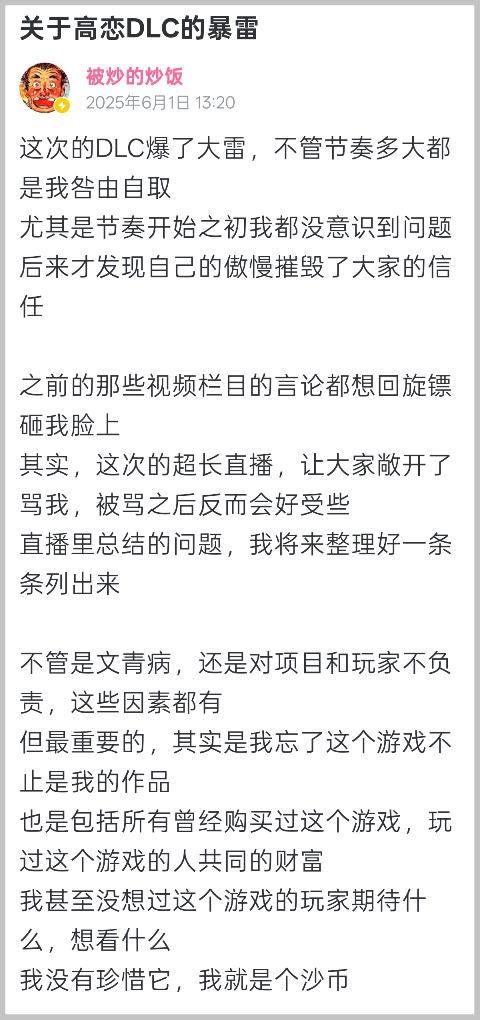 真正讓炒飯改變看法的,一位玩家連麥時的真情流露。老哥的語氣從最開始的憤怒,不解,到最後出現了哭腔,直到這時炒飯才意識到自己好像真的有問題,他的作品確確實實傷害到了一些曾經深愛《高戀》的人。