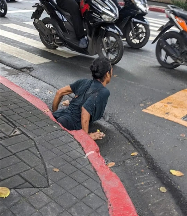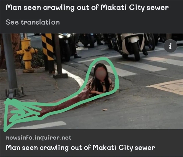 在菲律賓馬卡蒂市一個尋常的黃昏,攝影師威廉的鏡頭意外捕捉到都市傳説照進現實的魔幻瞬間——5月26日下午,當健身歸來的他駐足十字路口時,排水溝井蓋突然被頂開,黑色長髮裹挾着腐殖質氣味的女子如破土而出的神秘生物般探出上半身。這個被網友稱為"下水道美人魚"的瘦小女子,在眾目睽睽之下完成了一場驚悚又荒誕的都市行為藝術:她沾滿污漬的面龐綻放出令人毛骨悚然的微笑,像極了恐怖電影裏貞子爬出電視機的經典畫面,卻在與攝影師四目相對的瞬間突然加速逃離,留下瀝青路面上幾枚濕漉漉的腳印和數十部舉起拍攝的手機。