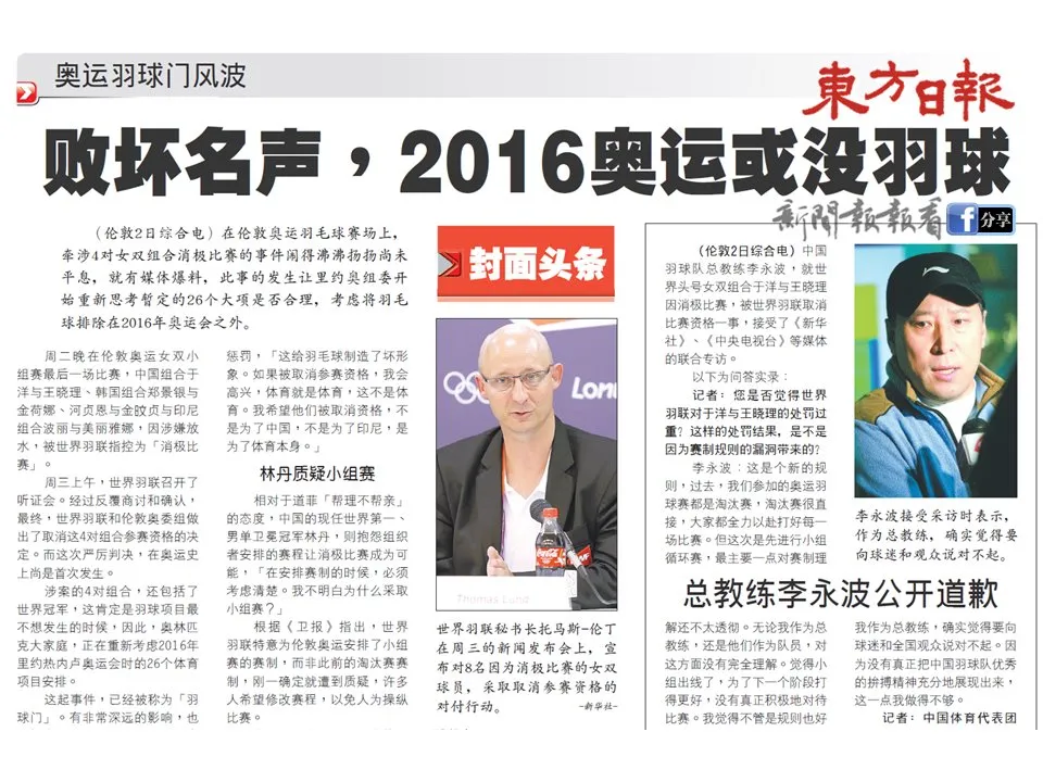 這一擺,就把世界羽聯擺到了國際奧委會主席羅格的“手術刀”下,也把國羽主帥李永波擺到了輿論風暴的中央。一時間,“羽毛球運動是否會因讓球醜聞被開除出奧運會”,成為了熱議的話題。