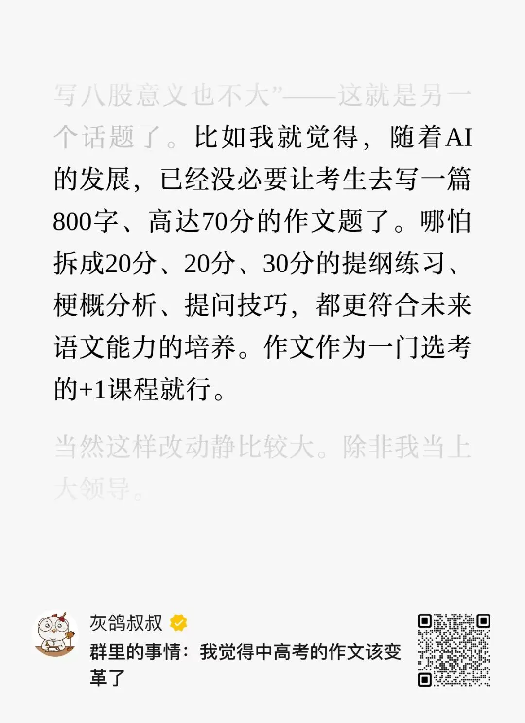 還有一個“次要原因”:我覺得作文考試模式該變了。在以前的推送中,也説過一些個人觀點: