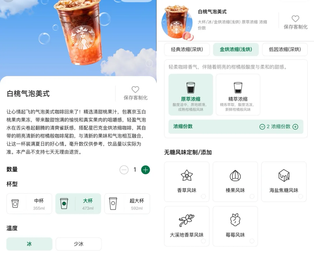 在星巴克,顧客點單時可根據喜好定製,從基礎的增加咖啡濃度、調整甜度、更換不同的奶基底或茶底,到加椰漿、摩卡醬、焦糖風味淋醬、可可碎片等定製飲品風味。
