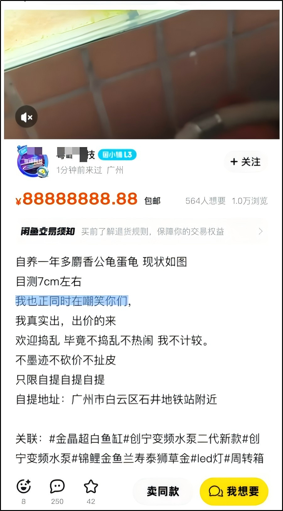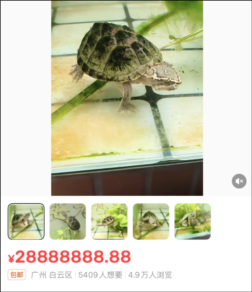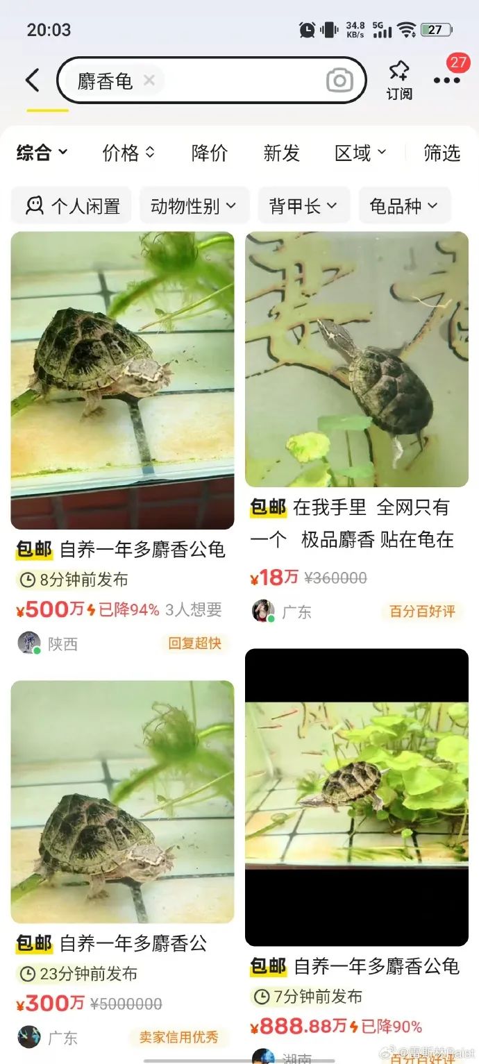 於是現在閒魚上出現了一大堆數十萬乃至數百萬的麝香龜,好不熱鬧: