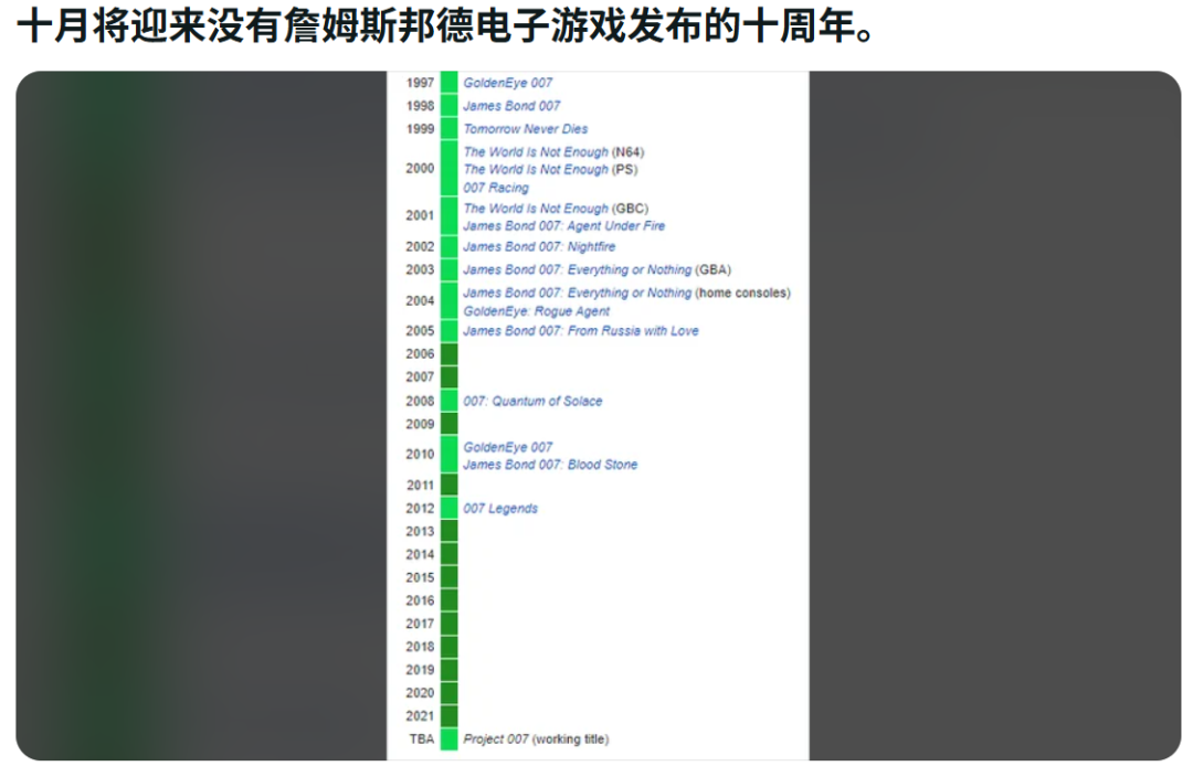 這倒不是説007系列沒出過遊戲,只是當時IP改遊戲的意義主要是為電影宣傳的一部分,製作工期受制於電影上映,做出來的東西自然好不到哪去。