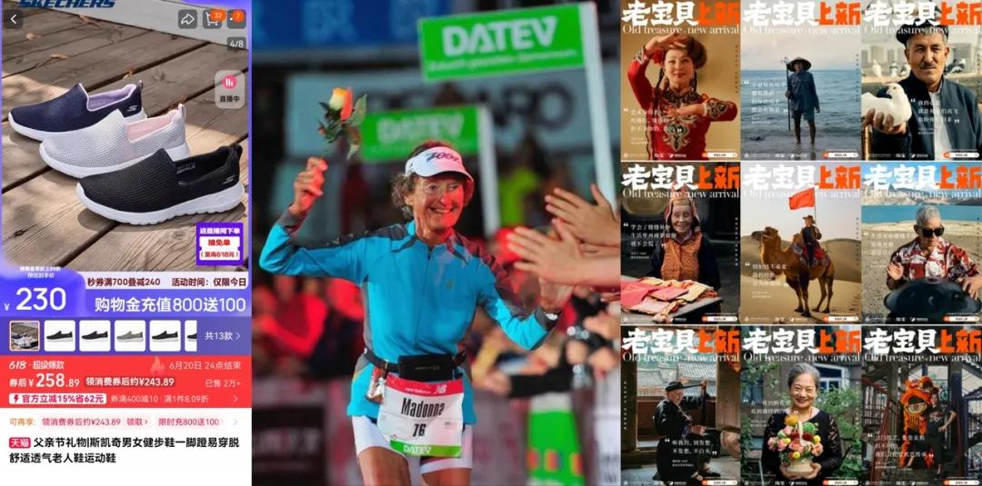 李佳琦和美ONE只是冰山一角。越來越多的消費品牌、互聯網平台瞄準銀髮一族:斯凱奇給自己打上「老人鞋」、「送父母必備」的標籤,耐克邀請86歲高齡的鐵人三項選手Sister Madonna Buder拍攝廣告,淘寶攜手中國老齡事業發展基金會上線「老寶貝上新」公益計劃,小紅書發佈了《爺奶版使用手冊》……