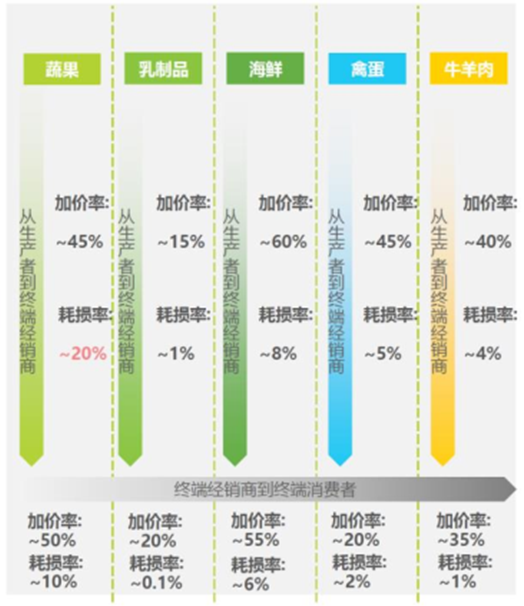 根據艾瑞諮詢的數據,對於食品生鮮類,傳統零售渠道都有20-55%的加價率,而且低效週轉的副產物是不低的損耗率。對於加工類食品、服飾等其他產品,加價率和庫存問題只會更大。